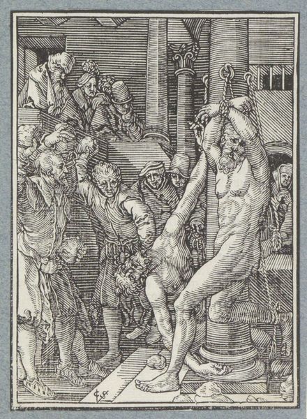 Editor: This is "Flagellation," a 1512 engraving by Albrecht Durer. The composition is brutal and stark. It really brings forth the intense cruelty of the event depicted, which really carries through, even as a print. As a historian, what catches your eye in this print? Curator: What immediately stands out to me is Dürer’s use of printmaking, specifically engraving, for such a graphic subject. In the early 16th century, the printing press was changing the very landscape of visual culture. How did this increased accessibility influence the ways religious narratives were received and understood by the public? Editor: That's a great question. I imagine, this print format really broadened exposure for Durer's works to people who never have, or never will, visit major collections. Curator: Precisely! Consider, also, the political climate. The Reformation was brewing, and images held immense power. Was Dürer’s portrayal of Christ’s suffering meant to incite empathy and devotion or perhaps even, given the context, to critique religious authority? How did the relatively affordable prints change access to artistic narratives beyond the patronage networks of the elite? Editor: It is compelling how something reproducible such as an engraving could have real power at the time and could change existing dynamics. But still, the agony is very prominent! Curator: Of course! Dürer’s masterful technique enhanced the emotional impact. And also keep in mind the market: what was the role of commercial printmaking in shaping religious devotion, and what does that mean today? Editor: That puts this engraving in an entirely new light for me. I was focused on the depicted event and aesthetic but not how Dürer used the historical and social context. Curator: And I was focusing on these socio-political factors, such as visual culture, production, and religion, whereas your sensitivity goes straight to the agony this visual carries. Perspective, I suppose, changes the lens!