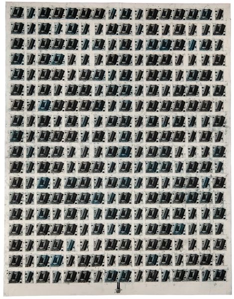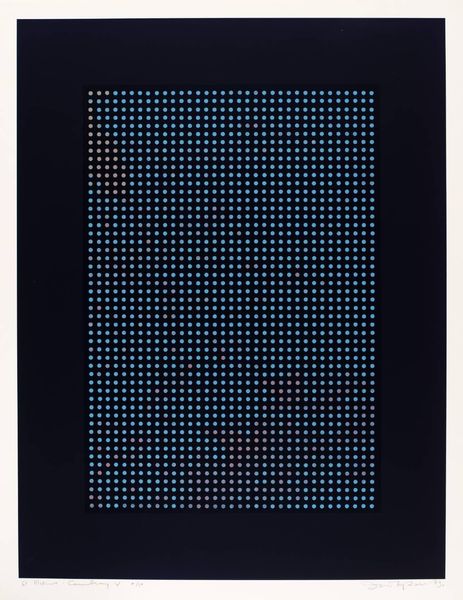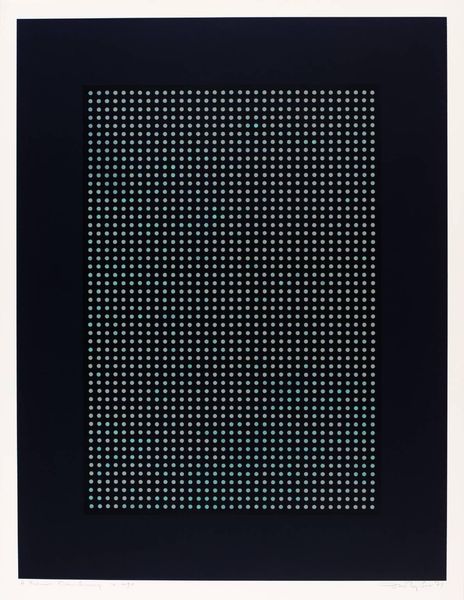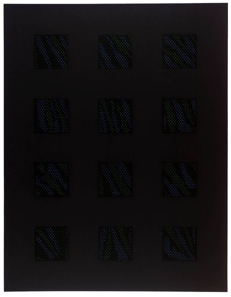 Editor: So, this is "The Graves 1" by Ian Tyson. It seems to be a print, dominated by black with these grid-like structures. It feels very minimalist. What do you see in this piece? Curator: I'm interested in the materiality of it. What kind of ink was used? How was the surface prepared? Those dots, are they printed or are they perforations, implying perhaps a commentary on industrial production or even surveillance? Editor: Perforations, that's interesting! It does make me think about data or code. Curator: Exactly! And within the context of its creation, how does it reflect the artist's engagement with the available resources and manufacturing processes? Editor: I never thought about it that way. I was so focused on the image. Now I want to know more about the printing techniques of that time. Curator: Precisely. Considering the materials and methods transforms our understanding of the work. Editor: Definitely. I'll be looking at art differently now!