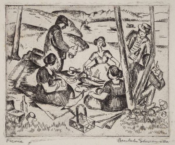 Curator: What a wonderfully odd, luminous quality to this piece! It's bathed in this dreamlike yellow, and those figures, they feel like they're emerging from a half-remembered story. Editor: Indeed. What you're reacting to is Paul Gauguin's "Martinique Pastorals," a lithograph and etching from 1889, now held here at The Met. It’s part of a larger portfolio of prints he did following a brief, transformative trip to Martinique. Curator: Martinique... you know, it really does have the feel of paradise lost. There’s a heaviness too. Are those women embracing or simply weary together? The goats fighting—it is idyllic, yes, but something feels troubled under the surface. Editor: Absolutely. Gauguin was, if nothing else, attuned to tensions, though sometimes he himself caused them. These prints, presented at the Café Volpini during the 1889 Exposition Universelle, mark a critical moment where Gauguin attempted to claim a symbolic territory outside of academic structures in France. Curator: And in choosing Martinique, wasn’t he deliberately turning away from that very center of power, while still wanting its approval? That whole scene felt rather charged, didn’t it? Almost performative, a theatrical challenge to artistic convention! Editor: Precisely. Remember, this was also a period of intense colonial activity. Gauguin’s journey and resulting artwork speak to the complexities of primitivism, which frequently exoticized cultures outside of Europe while appropriating their artistic motifs and visions for European audiences. Curator: Makes me think... what were the Martiniquans thinking as Gauguin wandered about, translating their lived experience through his very particular lens? Perhaps seeing through the eyes of the other does need more imagination, even tenderness. It’s never quite as simple as setting up an easel and claiming authenticity, is it? Editor: Never. The work raises profound questions about who has the right to represent whom and what gets lost, or twisted, in the process of artistic creation across cultural divides. Curator: It's a tricky path, full of beauty and moral landmines. Still, it’s those very complexities that keep us looking, keep us questioning, and keep art like this vibrantly alive, I suppose! Editor: Indeed, this pastoral scene serves as a striking reminder of the tangled relationship between art, culture, and the gaze that shapes them.