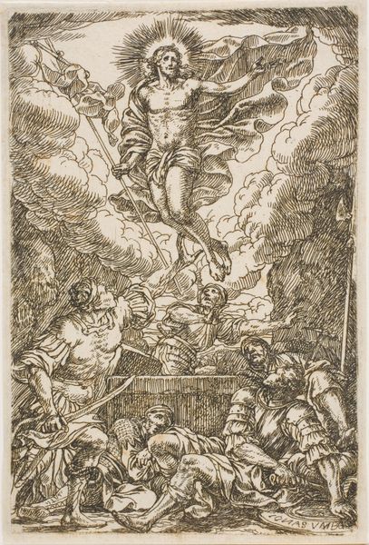 Editor: This is "Hemelvaart," or "The Ascension," a 1574 engraving in ink by Giovanni Battista Cavalieri. It's very linear, very detailed... there's a figure rising to the top surrounded by clouds, with many figures below. What story does this image tell? Curator: It's not just a story; it's a visual argument deeply embedded in the power structures of its time. Cavalieri presents Christ’s ascension not merely as a religious event but as a validation of divine right. Note the upward trajectory, a visual metaphor for hierarchy. Who is included, and perhaps more importantly, who is excluded? Editor: I see the apostles...and angels...so who might be excluded, or perhaps marginalized by this imagery? Curator: Consider the role of women in religious narratives of this period. How are women absent, and what does their exclusion tell us about the societal power dynamics being reinforced by Cavalieri's composition? Think about whose stories get told, and whose get left out of the frame. This impacts contemporary understanding. Editor: So, even this heavenly scene has earthly implications. I see what you mean. It's not just about faith but about reinforcing power. Curator: Exactly. By understanding these historical contexts, we can analyze how these images have shaped our cultural understanding and continue to influence contemporary power structures. What do you make of the city at the very bottom of the image, and the hands pointing to Christ above? Editor: Interesting. The city below could represent the earthly realm Christ is leaving, or some city like Rome itself. As for the pointing, it reinforces the importance of his ascendance into heaven as well as directs our eyes to follow him. I hadn't considered the perspective of power when viewing this artwork before! Thank you for offering that critical reading of this piece.