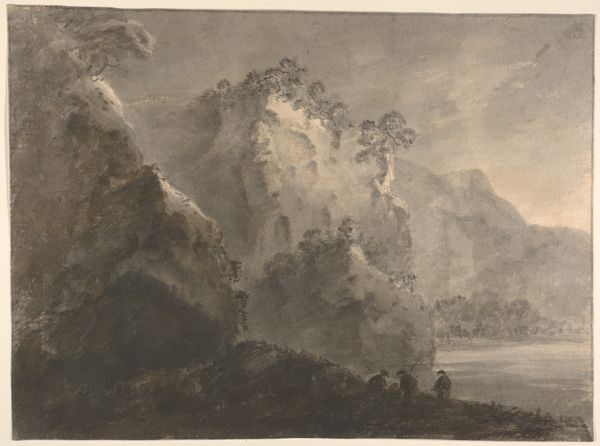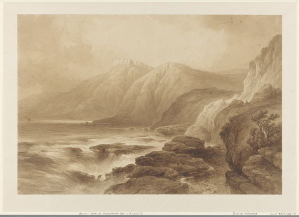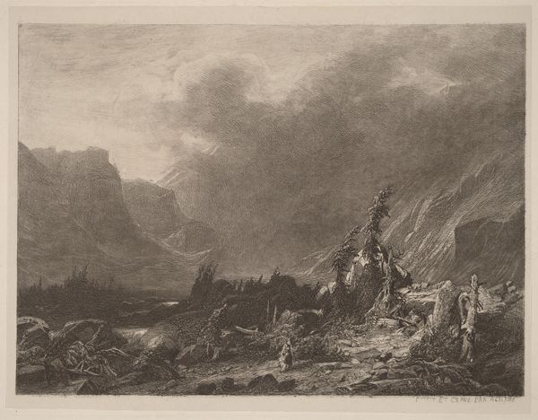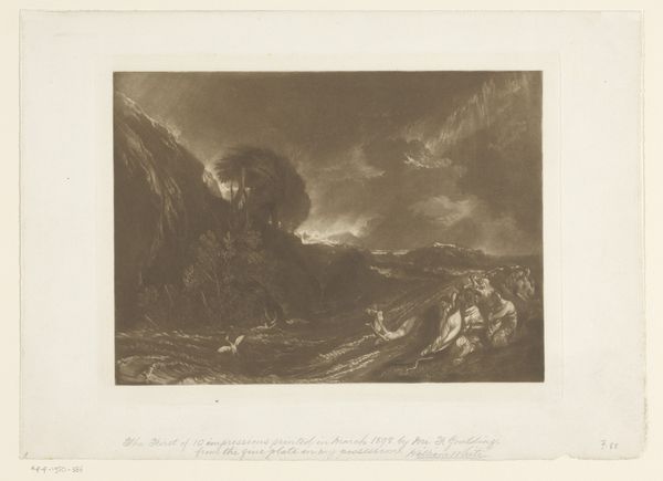 This etching, Mêr de Glace, Valley of Chamouni-Savoy, was created by Joseph Mallord William Turner as part of his ‘Liber Studiorum.’ Look closely, and you’ll see that it presents a dramatic scene dominated by monumental peaks and a vast expanse of glacial ice. Turner masterfully employs sepia tones to evoke a sense of the sublime. The composition is structured around strong vertical lines of the mountains. These contrast with the horizontal movement of the glacier, creating a dynamic interplay of forms. Note the tonal gradations and intricate textures, achieved through a combination of etching and mezzotint. Turner's use of light and shadow transforms a topographical study into a meditation on nature's awe-inspiring power. The print resonates with Romanticism's fascination with the grandeur of the natural world. It invites us to consider the relationship between human perception and the sublime. How does the artwork challenge our expectations about landscape representation and the picturesque?