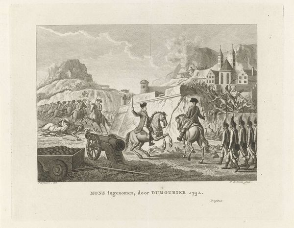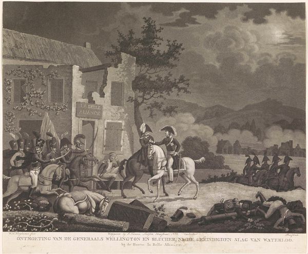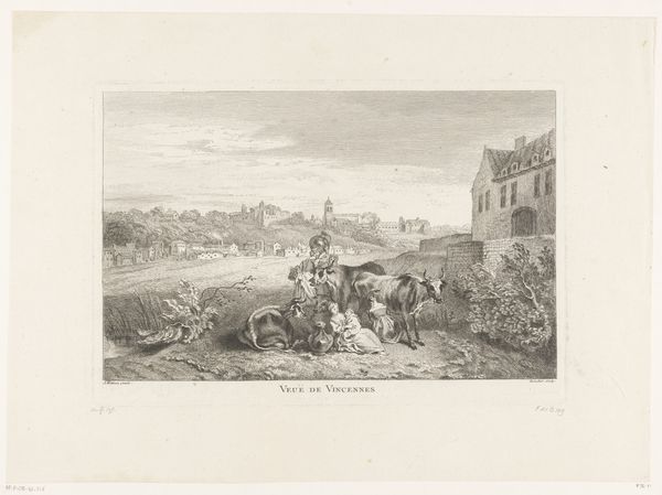 Editor: This is "La dînée des voyageurs" by Jean Baptiste Michel Dupréel. It depicts travelers pausing for a meal, and what strikes me is the circular composition. It almost feels like a window into another world. What do you see when you look at it? Curator: Indeed, the circular frame is a deliberate construct. Observe how Dupréel uses light and shadow to guide the eye, creating a balanced yet dynamic interplay between the figures and the architecture. The contrast enhances the narrative within the composition. Editor: So, the composition itself becomes part of the story? Curator: Precisely. The artist uses formal elements to direct your gaze, inviting scrutiny of the represented figures and their relations to the scene. Have you seen other artworks that use composition in a similar way? Editor: That’s a great point. I’ll have to think about it more. Thanks! Curator: My pleasure. Always a delight to examine the construction of an artwork.