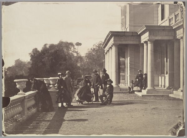 Curator: This gelatin-silver print, entitled "Groep personen op een koets met vierspan voor landhuis Nimmerdor, Amersfoort", captures a group of people on a horse-drawn carriage, posed in front of a country house in Amersfoort. The photographer is Henry Pauw van Wieldrecht, and it's dated 1903. What are your first impressions? Editor: It feels staged, certainly. The overall tone is rather muted. Despite the grandeur of the house, draped in what appears to be ivy, there is something melancholic in the static arrangement and almost dreamlike softness. Curator: Yes, that softness is intentional, a hallmark of Pictorialism which sought to elevate photography to fine art. It mimicked the effects of painting, favoring atmospheric effects over sharp detail, something often called "fuzzygraphy" in its own day. What significance might the choice of that style hold here? Editor: The deliberate softness adds a layer of nostalgia, mythologizing this family and their social status. It isn't simply a portrait; it aspires to be something more profound, to encapsulate an entire era, almost a fable-like memory of prosperity and comfort. The subjects blend into the surrounding building's facade that mirrors a kind of visual conformity between their attire and architecture. Curator: Notice the framing; how the carriage and the figures upon it are arranged. They aren’t haphazardly placed; they're posed for maximum visibility. We must think of the horse-drawn carriage less as transport, more as stage, carefully set, arranged with those faces, carefully picked, positioned to address some assumed notion of lineage or social standing. The faces almost tell of collective heritage. Editor: The uniformity in dress certainly enforces that collective identity, visually reinforcing their class belonging. Yet, doesn't it also suppress individuality, each figure becoming part of the backdrop, no more distinct than the windows and the foliage. There’s a sense of both performance and containment at play, both here and in their tightly constrained composition. Curator: I agree. It’s a visual paradox; their presentation exudes freedom and command, yet their fixed posture hints to subtle constrictions of belonging to high society. The image, ultimately, doesn’t only capture a moment, but a constructed history, both of family and nation. Editor: An idealized, perhaps even romanticized, history—where form serves to conceal as much as it reveals. The technical choices made in taking the photo offer us something that reflects both control of an image, and those controlled within it.