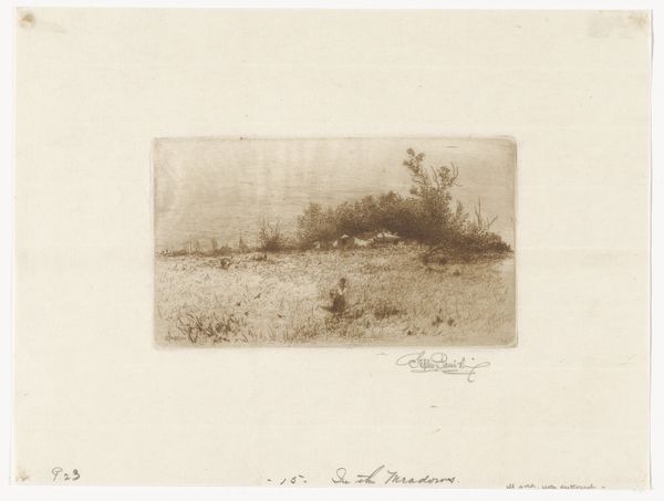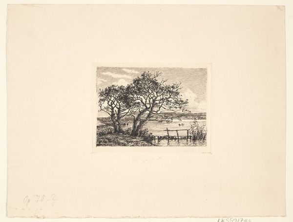 Editor: This is "Two Trees - Sketch" by Stephen Parrish, dating back to the 19th century. It’s currently housed here at the Minneapolis Institute of Art. It’s an etching on paper. I'm immediately drawn to its quietness. It feels like a stolen moment in nature, a whisper rather than a shout. What do you see in this piece, something beyond just the trees themselves? Curator: Ah, yes, a whisper indeed! It reminds me of those fleeting moments when nature reveals a secret, just for you. What strikes me is the artist's ability to capture the *feeling* of a place, not just its appearance. Think about it: etching demands a steady hand, a decisive line. Yet, Parrish manages to evoke a sense of transience, the rustle of leaves, the shifting light. Do you notice how the bare branches reach towards the sky, almost like supplicating arms? Editor: They do seem to be reaching, as if trying to grasp something intangible. I'm used to seeing really dramatic landscapes in the 19th Century art but this feels so personal. Curator: Exactly! This is impressionism at its most intimate, don't you think? It’s not about grand vistas, but the personal experience. He’s inviting you to slow down, to breathe in the atmosphere. Consider also how Parrish subtly uses light and shadow; almost a blurry scene, and you find yourself filling in the gaps, projecting your own emotions onto the landscape. He isn't telling you what to feel; rather he provides the space *to* feel. It’s like he captured a little piece of his soul there. Editor: I see what you mean. It’s less about what's there, and more about what it makes you feel. I initially saw only a quiet landscape but now I recognize its quiet emotional complexity. Curator: Precisely! And that’s the magic of art, isn’t it? A simple sketch of two trees opens up a whole world of feeling, experience, and thought. I think I might revisit it myself now with fresh eyes.
