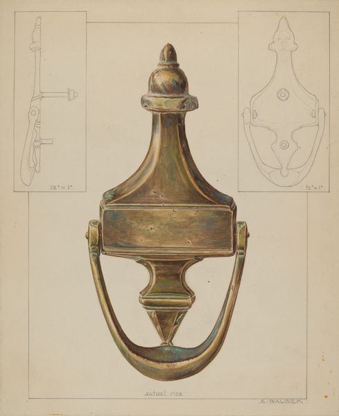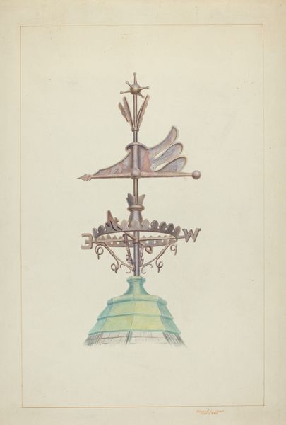 Curator: We're looking at Ernest A. Towers, Jr.'s "Weather Vane," circa 1938. It's a delicate rendering in watercolor and light pencil work. What are your immediate thoughts? Editor: It has this odd combination of the technical and the whimsical. It's as if a blueprint for an old weather vane has been overlaid with a child's naive watercolor painting. The scale, that’s roughly a foot long, right? Curator: Yes, you can see from the little drawn rectangle in the top-left of the aged paper it shows a 14”x4” view of its height and width. The watercolor and toned paper certainly give it a nostalgic feeling, an echo of times gone by. Editor: Precisely. But what's really grabbing me is the construction depicted in the rendering. The layering of metal – you've got a sense of heft despite the watercolors, the implication of the way it moves with the wind, this gives real weight to the object it depicts. The craftsman of the vane paid a great deal of attention to it's aesthetic. Curator: A compelling observation. Structurally, the placement of the fulcrum implies the balance of forces necessary for it to function correctly. Note the repetition of circular motifs. And consider the elegance of the arrow; it directs our gaze, not just to the wind’s origin, but into the future, to a point beyond its creation. Editor: The means by which we can find where to travel! The arrow serves less as an instrument of power and more as an open ended tool, almost a collaborative mechanism. What do you think Towers intended in selecting this vane? I'd want to better know who manufactured these types of objects in that period. Curator: Perhaps Towers saw in the weather vane an intersection of art, craft, and utility—a symbol of humanity's ongoing attempt to understand and harmonize with the natural world through semiotic objects. Or maybe it was the semiotic tension inherent in its dual nature: a functional object imbued with ornamental design. It really encapsulates art deco design during that period. Editor: In short, this little watercolor sketch leads us down interesting roads, making one ponder. Thanks! Curator: Indeed, a testament to the enduring power of observation, a lovely example of the era's style meeting function.