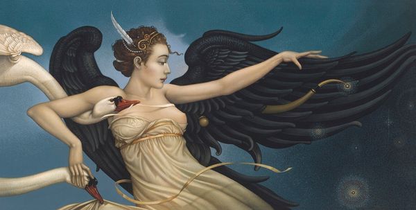 Editor: Here we have Michael Parkes’ "Night Flight", an oil painting described as fantasy or surrealist art. It feels so dreamlike! What do you see in this piece, looking at its making? Curator: I'm struck by the deliberate layering of oil paint. You see the translucent glazes building up the skin tones, contrasted by the crisp, almost hyperrealistic depiction of the swans. It draws attention to the artifice of representation. Look at how the rendering aims to give the impression of photo-realism but clearly falls into the surreal. It begs us to consider the means by which this illusion of fantasy is created. Editor: So you mean how Parkes uses materials and his method to kind of, reveal the trick, or question reality? Curator: Precisely! How do these highly worked surfaces make you feel about the division between high art and perhaps, commercial illustration, considering fantasy art's popular appeal and avenues of dissemination, for example, as prints or book covers? The oil medium is associated with old masters. How does this conscious selection influence the art, its context and, dare I say it, its 'value'? Editor: I never thought about how his material choice sort of elevates fantasy, and brings those questions to light! Fascinating. I learned a lot about considering the social context through the means of production, thank you! Curator: Likewise. Looking at art this way gives us a powerful lens. The focus on material is how art both affects, and is affected by, the social.