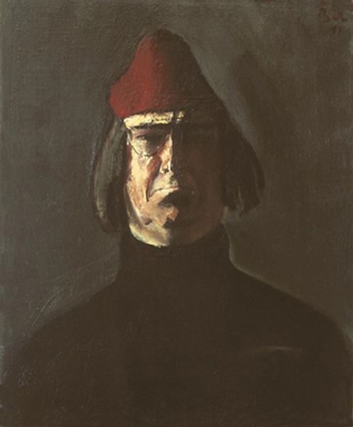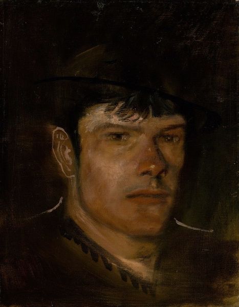 Curator: This is Ladislav Mednyánszky’s “Dandy in Fur Cap with Pipe,” painted sometime between 1877 and 1880. Editor: Somber. Intimate. There's an immediate sense of melancholy conveyed by the restricted palette and the subject’s direct gaze. It feels like an unfinished thought. Curator: Mednyánszky himself was a complex figure. Coming from an aristocratic background, he nonetheless felt a strong connection to marginalized communities, often depicting the rural poor and outcasts of society. One could argue this is self portrait of an intellectual and his own conflict. Editor: It is true; his face seems shadowed by a kind of internal struggle. What strikes me, though, is the technical approach: the loose brushwork and the heavy chiaroscuro lend it an immediacy that transcends its historical context. It seems so modern. Curator: Yes, and Mednyánszky worked outside of the established academic circles of his time, developing a more personalized, realist style that resonated with Symbolist circles. His images can read as comments on class and identity, with Mednyánszky inserting himself into social portraiture. Editor: Observe how the dark fur cap dominates the composition. Its texture is suggested with rapid strokes that seem to almost dissolve into the dark background. The artist is concerned with an impression of detail rather than photorealism. The play of light across the face is similarly evocative rather than descriptive. Curator: Exactly. Also, consider the symbolic weight of the pipe. It isn't merely a prop, but a cultural marker of intellectual or bohemian circles at the time. Mednyánszky consciously chooses his visual identifiers to make a statement of identity. Editor: What an introspective exploration of shadow and suggestion! The ambiguity of the details only intensifies its magnetic draw, it captures a mood so perfectly. Curator: Indeed. Considering his conflicted social standing, it’s not surprising that his identity should be so enigmatic, yet full of commentary. Editor: The artist masterfully merges formal innovation with emotional depth, which will undoubtedly draw in viewers.