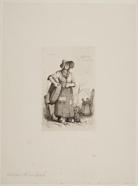 Andreas Achenbach's rendering of a Scheveningen fisherwoman presents a tableau rich with symbols of labor and community. The woman, adorned in traditional garb, carries what seems to be the tools for her craft: a container for collecting her catch. This simple object becomes a vessel of life, intrinsically linked to the cycle of nature and human existence. We find echoes of this motif in the ancient world, consider images of cornucopia, symbolizing abundance and divine favor, or the vessels carried by water nymphs in classical art, each one a signifier of fertility and sustenance. This act of carrying is deeply embedded in our collective consciousness; the woman’s stance, her gaze, evoke a primal connection to the land and sea. The fisherwoman is a modern echo of antique traditions, an example of how symbols from antiquity continually resurface, transformed yet resonant with their past.