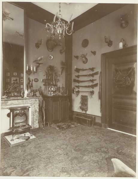Editor: Here we have a photograph, likely taken sometime after 1920, titled "Kunstenaar Benjamin Prins in zijn atelier in de Plantage Franselaan 25 in Amsterdam" by Sigmund Löw. It's a really fascinating image – very crowded and domestic, offering an intimate peek into an artist's working space. What stands out to you about this photograph? Curator: I see an accumulation of materials telling a story of production and labor. This isn't just a portrait of the artist, it's a document of his working conditions, the means through which art is made. Look at the density of objects. The various paintings on display and in progress suggest a constant cycle of creating, displaying, and potentially consuming art within this domestic sphere. How does the staging of the studio impact how you understand the value, and labor, of art creation? Editor: I see what you mean. It feels less about the individual genius and more about the sheer work and accumulation involved. All those props, the furniture – they are as essential to the art-making as Prins himself. Do you think the photographer was trying to challenge traditional ideas of the artist? Curator: Perhaps, but it’s also documenting a particular kind of bourgeois artistry. This isn't a garret; it's a comfortable, cluttered, almost mercantile space. It prompts questions about who consumes this art, the class dynamics at play, and the relationship between artistic production and market forces. Notice the crafted heater and carved tables. They show a collapsing boundary between “high” art and domestic craft, indicating an aestheticised existence. How does seeing the "after 20" date influence your read of it, knowing industrialisation was surging during the era? Editor: That is really interesting! Knowing the date adds another layer. It makes me wonder if the traditional aesthetic was intentionally preserved and celebrated against mechanization. I never considered the space itself being so integral to the meaning of the artwork. Curator: Exactly. Thinking about the process and the materials—including the physical space—helps us to understand art as a product of specific social and economic forces, challenging the myth of the solitary genius.