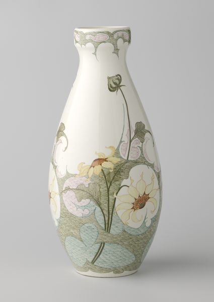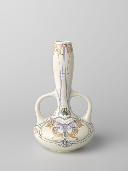 This earthenware vase, made by the Arnhemsche Fayencefabriek, is adorned with stylized floral motifs, a hallmark of its time. The stylized pinecone motifs, prominently displayed, are evocative of nature's bounty and the cycles of life and rebirth. These motifs echo the visual language of ancient Roman art, where pinecones were linked to Venus, symbolizing immortality. Similarly, the floral patterns remind us of the ‘horror vacui’—the fear of empty space—found in medieval tapestries, where nature fills every corner. The vase’s handles, gracefully arching, evoke a sense of containment and flow, stirring deep emotions through the vessel’s dynamic forms. This visual echo demonstrates the complex interplay between cultural memory and artistic creation, revealing how symbols evolve, adapt, and resurface across time, continually renewing their significance.