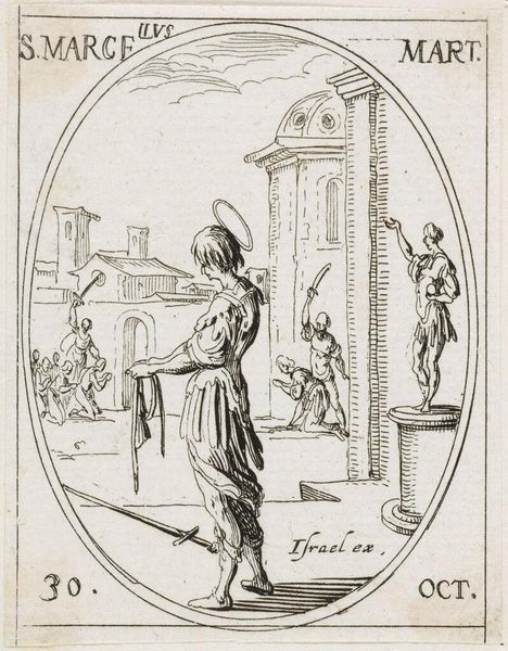 Editor: This small etching by Jacques Callot depicts Saint Marcelus. The sharp lines create a somber mood. What can you tell me about the material process in relation to the subject? Curator: Callot's etching, a reproducible medium, democratizes the image of Saint Marcelus. How does the choice of printmaking, a process reliant on labor and mass production, affect our understanding of religious iconography typically reserved for unique, precious objects? Editor: That's interesting. So, the process shifts the meaning. Thanks! Curator: Precisely. Considering the broader market for such prints highlights how art functioned as both spiritual and commercial commodity.