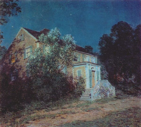 Curator: Before us is Willard Metcalf's "Old Homestead Connecticut," painted in 1914. It currently resides here at the Saint Louis Art Museum. Editor: It’s striking how the composition pulls you in. The stark contrast of the shadowed building against that almost ethereal blue backdrop… It evokes a very specific kind of solitude. Curator: Metcalf, often associated with American Impressionism, engaged deeply with themes of rural identity in transition. The homestead, a recurring motif, invites consideration of early 20th-century American agrarian life and the societal shifts around industrialization and urbanization. The imagery harkens back to a rapidly disappearing pre-industrialized past. Editor: And note the almost obsessive application of broken color, particularly in the foreground. The layering of brushstrokes suggests form without precisely defining it, lending the scene a dreamlike quality, far from photorealistic precision. Curator: Precisely. The plein-air approach aligns him with the Impressionists, yet Metcalf tempers the avant-garde with a decidedly American sensibility focused on portraying national identity, a sense of belonging that was undergoing profound changes during that period. How did these idyllic images mirror the social transformation affecting rural communities, even acting as an affirmation of traditional life amid disruptive modernization? Editor: Beyond historical context, though, I'm drawn to the expressive power of the paint itself. Look at how the artist used subtle gradations of light to imply depth and texture, creating the atmospheric perspective. The strategic placement of that dominant tree almost divides the canvas, offering visual pathways that constantly guide the eye. Curator: Agreed. By framing it this way, Metcalf highlights the intricate relationship between nature and human intervention. This seemingly humble farm becomes symbolic, imbued with an evocative potency regarding land ownership, labor, and generational changes, especially through the use of fencing as a clear separation of realms. Editor: The formal elements truly serve the emotional impact, don’t they? What might seem like a simple depiction of a rural scene reveals layers upon layers. Curator: Indeed, through a consideration of Metcalf's art and his "Old Homestead Connecticut," one can come to perceive the work beyond the superficial landscape depiction, uncovering significant socio-cultural insights and challenges concerning a past epoch. Editor: Seeing it through that prism gives a new perspective, going past just its optical charm, revealing its powerful artistic design.