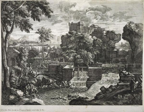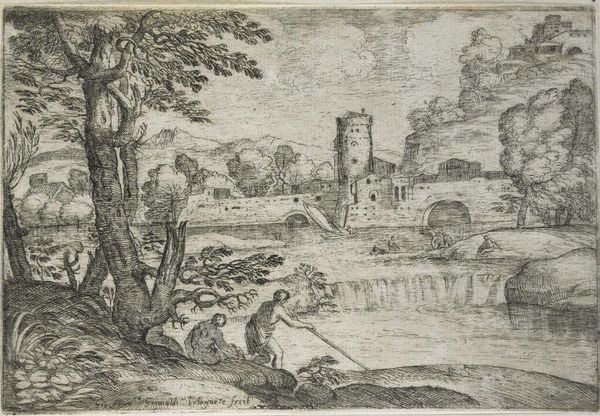 Editor: This print, Jacques Prou's "Rocky Landscape (with Women Washing Clothes)," presents a scene that feels both timeless and somewhat melancholic. What visual cues do you notice in this image? Curator: I'm struck by the way Proust uses the landscape itself. The ruins, the mountains, the water – they become symbols of endurance, survival, and constant renewal. Note the women washing clothes, performing a task both mundane and essential. Editor: So the image carries the memory of those repetitive tasks? Curator: Precisely. The women enacting this ritual in this landscape highlights the cyclical nature of life, the way the past and present intertwine, and the endurance of community through labor. Editor: That adds a new layer of understanding. I now see how Prou's imagery evokes an enduring cultural memory. Curator: Indeed, visual symbols reflect continuity in ways we often overlook.