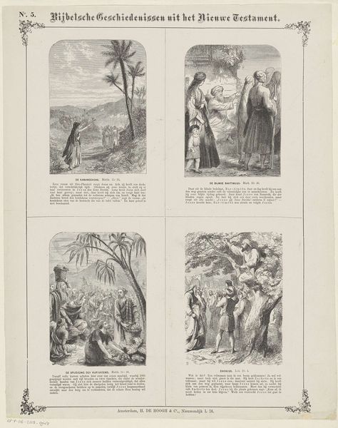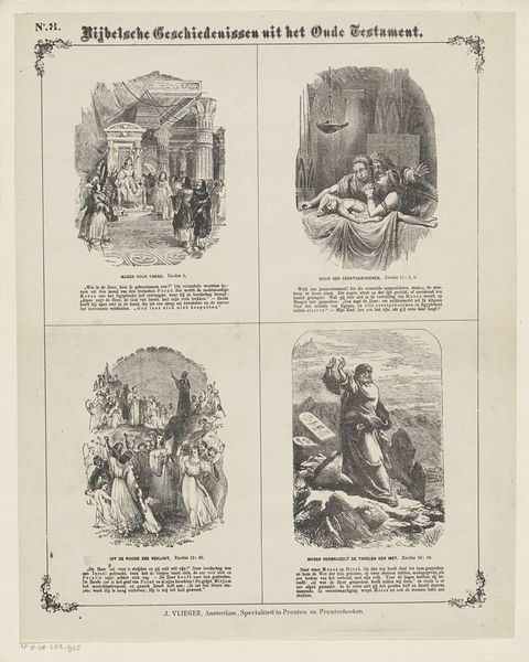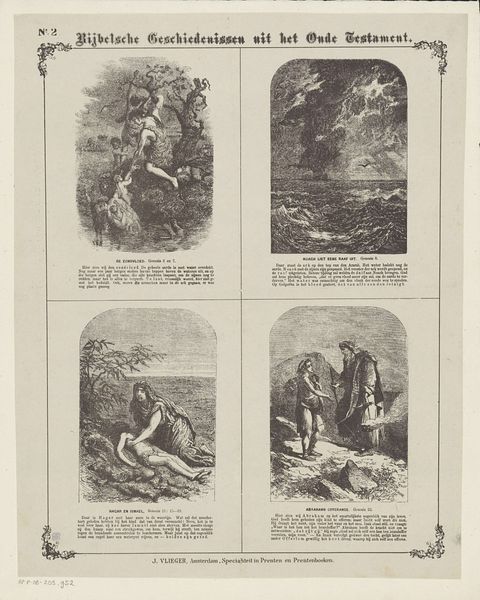 Curator: This print, titled "Biblical Stories from the Old Testament," was created between 1871 and 1908. The artist, W. Cheshire, presents four separate vignettes, all rendered through the meticulous technique of engraving. Editor: My first thought is that each of these tiny stories has the same mood: shadowed, quiet and kind of solemn. All that inky black makes each image feel like a memory. Curator: Precisely. Cheshire's engagement with light and shadow, rendered through the stark contrast of engraving, is structurally paramount. Observe how the compositions use this contrast to delineate not only form, but also to imbue the narratives with a certain gravitas. Each of the four sections feels dramatically distinct. Editor: It's interesting to see the stories chosen; one frame seems to be a consecration of some sort, the other one of them harvesting something. They hint at daily lives amid the legendary stuff, perhaps. How clever. The layout also reminds me of illuminated manuscripts—those decorative borders! Curator: Yes, those border designs borrow heavily from medieval aesthetics, signaling the historical depth the work evokes. But I would propose focusing our understanding on the narrative's formal construction; the division into quadrants affects how we understand time and relation across these images. It implies causality and distance simultaneously. Editor: True, the layout tells its own story in that sense, but the raw, emotive weight of that intense black ink gets me. It communicates this potent spiritual story. Each scene could be happening in the dark of someone’s memory, couldn’t it? Curator: A persuasive interpretation. The tension between technique, medium, and emotional resonance adds layers to the viewing experience. Editor: Exactly, seeing those stories told through such fine detail gets me imagining where they sit in history, where they sit in memory, where they touch down in the now.