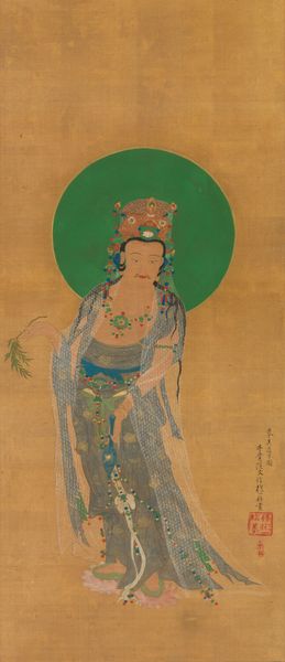This hanging scroll, depicting the Bodhisattva Willow Kannon, was made in China during the Tang dynasty by Wu Daozi, using ink and color on silk. The supple, absorbent nature of silk allowed Daozi to achieve a subtle and highly detailed image, with thin, modulated lines and delicate washes of color that describe Kannon's flowing robes, jewelry, and serene expression. The artist’s skilled manipulation of the brush is evident in the varying line weights and controlled gradations of tone. The choice of silk as a ground for painting was significant in its own right, reflecting its status as a luxury trade commodity and its use as a support for calligraphy and paintings. The techniques and traditions evident in this work, also demonstrate the artist’s deep engagement with both the aesthetic and material culture of his time. Ultimately, a close look at the materials and processes used to create this painting enhances our understanding of the cultural significance of this exquisite artwork, and the rich artistic traditions it represents.