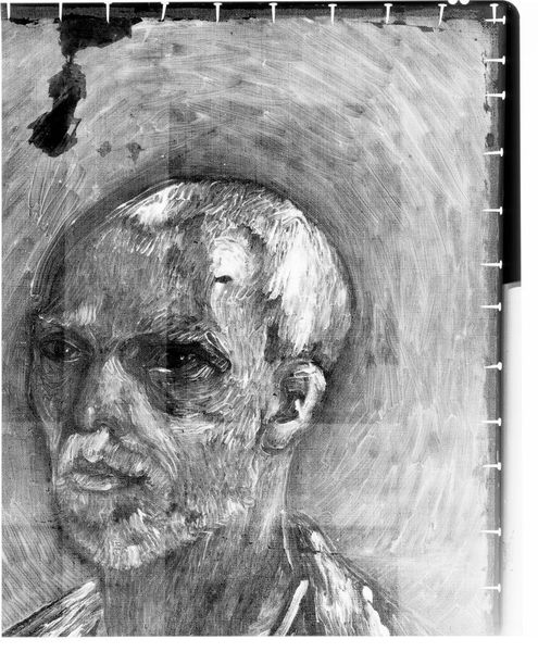 Curator: Here we have an X-radiograph of Vincent van Gogh's "Self-Portrait Dedicated to Gauguin" from the Harvard Art Museums. The film measures about 14 by 17 inches. Editor: Wow, seeing it like this, almost skeletal, gives you a sense of the raw energy, the hidden layers and struggle beneath the surface. It's hauntingly beautiful. Curator: Indeed. This X-ray offers a fascinating look beneath the visible paint layers. It reveals Van Gogh's process, how he reworked the canvas. Editor: It's like seeing the ghost of his artistic decisions. You can almost feel his hand moving, reconsidering, battling with the image he wanted to create. The anguish is palpable, even in this reversed, spectral form. Curator: It also speaks to the material realities of artmaking. Canvas was expensive, so artists often reused them, painting over earlier works. Editor: Knowing that there are hidden images beneath the surface, veiled narratives... it adds another layer of mystery to the artwork. It makes you wonder what else is hidden, not just in art, but in life. Curator: Absolutely. And understanding the economic and material constraints helps us to better appreciate Van Gogh's resourcefulness and artistic choices. Editor: It's funny; looking at it this way, you realize how much art is about more than just the visible image. It's about process, struggle, and the hidden stories waiting to be discovered.