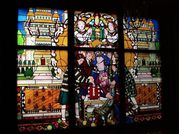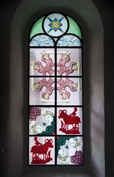 Curator: Tiffany's "Lilies," or more formally the "Corey Memorial Window," created between 1892 and 1895. It's breathtaking in person, located here at the Art Institute. A symphony of light and glass. What's your initial impression? Editor: I'm immediately struck by its ethereal quality, it has that kind of hushed reverence that makes you feel as though you have entered a sacred space. A quiet beauty emanates from it. Curator: Absolutely! The lilies themselves, rendered in such delicate detail, seem to almost glow. Lilies often symbolize purity, resurrection, hope... Do you sense that iconography coming through here? Editor: Most definitely. Lilies, of course, have powerful funerary associations. They connect death, mourning, and a peaceful sense of ascension. But there's more, notice the placement. They almost rise from the depths—dark, verdant green turning towards heavenly light. A clear narrative, would you say? Curator: A dance of light and dark, perhaps? A dialogue, as well? Tiffany was a master of layering and manipulating glass to create this sense of depth, which enhances the symbolism, making it less about textbook symbolism and more about a lived emotional experience. It's the emotion, you see? It shimmers, sighs, whispers! Editor: Indeed, it’s as though you're gazing into someone's memory of beauty. And consider the medium—stained glass is designed to transform sunlight itself into the image. So death and life are present— light overcoming the void of the church interior. Do you agree, that Tiffany's clever technique enhances such symbols, here? Curator: Perfectly said! He used the medium, here glass and light, to evoke these potent images, this sacred moment, from memory. It transcends memorial into something transcendent! Editor: For me, too, the overall feeling resonates— a moment frozen in stained glass for generations to reflect and perhaps be uplifted by it. Curator: A visual hymn, perhaps, and certainly one that continues to touch the hearts of those who behold it. Editor: Precisely, a luminous reminder of fragility, faith and fleetingness. Thank you for pointing that out!