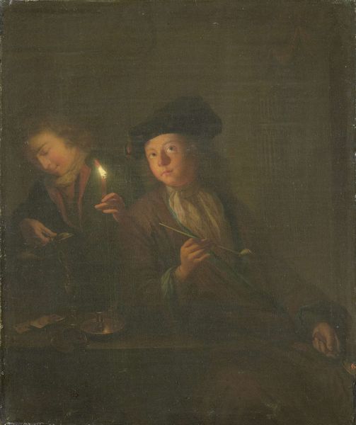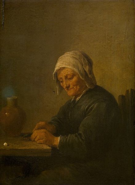 Curator: Gazing at this painting, Gerrit Dou's "Girl with An Oil Lamp at a Window", it immediately brings to mind hushed evenings and secret vigils. Don’t you think? The warmth of the candlelight feels so intimate, like a shared secret. Editor: The use of oil paint creates such depth, doesn’t it? It's a rather beautiful, but everyday, moment – and the cost of those pigments couldn’t have been cheap, meaning someone labored to afford this captured moment. How fascinating that light became an accessible tool in the process. Curator: Absolutely. Dou really understood how light shapes not only the subject, but the story. You can almost smell the beeswax and hear the quiet crackle of the flame as she holds this metal lamp. And her gaze, wistful, searching—wonder what she sees? What are her dreams, I wonder? Editor: I imagine it's important to see this as an allegory too, isn't it? I imagine access to fuel was difficult to control – even though it might appear as something commonplace, for me the production of this kind of item shows how power comes in different, accessible forms, no? Curator: Perhaps! The Dutch masters certainly knew how to load symbolism onto seemingly ordinary scenes, so that is possible. But there's also just a quiet humanness here. The slightly smudged shadow, the imperfectly smoothed hair. It all feels so... real. What do you feel most keenly? Editor: The visible effort behind achieving that realism is fascinating. Grinding pigments, layering thin glazes, and manipulating that oil on the panel. The skill required is really amazing - and for a work of, as we’ve stated, "everyday" circumstances. Curator: Yes, all of this contributes to the palpable effect. It feels as though we’re peering into a window into another world, glimpsing something ephemeral, almost as a half-remembered memory… Editor: Exactly! It’s that tangibility – the connection between hand, material, and subject – that makes this so compelling and speaks so strongly to labor throughout generations! Thank you!