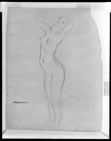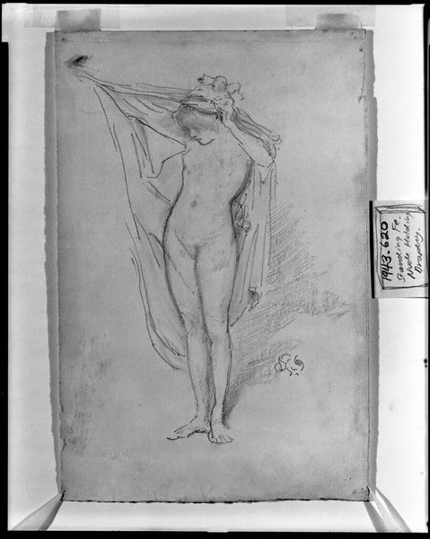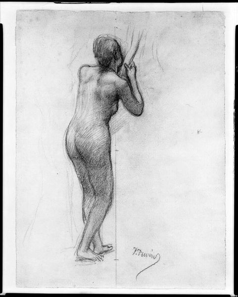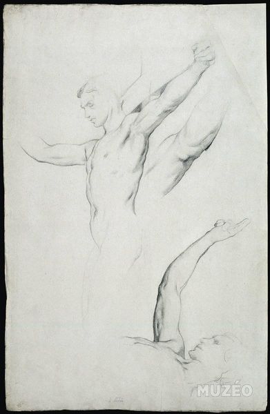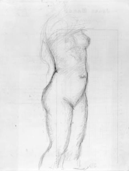 Editor: Here we have Pierre Henri's "Nude Study for 'Ludus Pro Patria'," a sketch of sorts. It feels like a fleeting glimpse, like catching someone in a private moment. What can you tell me about this piece? Curator: It whispers of the Neoclassical ideals Henri was steeped in, doesn't it? The grid beneath suggests a meticulous process. Do you notice the subject's gaze upward, almost searching? Editor: Yes, it gives them a vulnerable quality. Was this typical of the time? Curator: The vulnerability, perhaps not overtly. But the idealized form, definitely. Think of it as Henri trying to capture not just a body, but an ideal of civic virtue, destined for a larger narrative. Editor: So, it's more than just a nude study; it's about national pride? Curator: Precisely! And that shift in perspective, it’s what makes looking at art so rewarding, wouldn't you agree? Editor: Absolutely. Thanks, I'll remember that!
