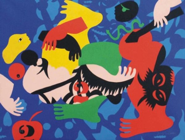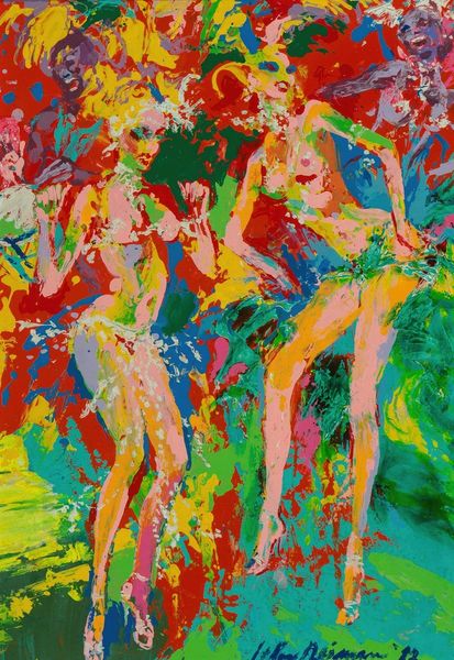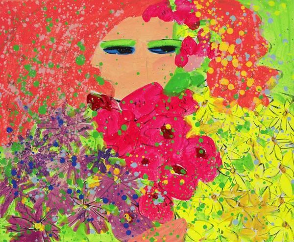 Editor: Here we have Walasse Ting's "Blue Lady, Purple Lady", made with mixed media on canvas. The two portraits facing each other are playful but also oddly detached. How do you see these figures interacting through color and form? Curator: The composition hinges on a fascinating juxtaposition. Note how the artist employs a split diptych format, clearly demarcating space through color. On the left, a cooler palette of blues and yellows predominates, contrasting with the right panel's warmer purples and pinks. This chromatic division suggests not harmony, but a visual tension. Editor: So you see the colours creating division? Curator: Precisely. The seemingly whimsical splatters of paint are carefully orchestrated; they disrupt the clean lines of the portraits and refuse a cohesive surface, further fragmenting any narrative unity. Consider the flatness of the picture plane as well. What does it evoke? Editor: A sense of being visually direct, honest? Curator: Indeed, there is an absence of traditional modelling or shading; by employing stark colors the artist draws attention to the inherent qualities of painting. Line becomes as important as volume; colour assumes a structural rather than merely decorative role. What does this overt materiality of painting tell us about the artist's intention? Editor: Maybe the artwork isn't meant to 'mean' anything, that the feeling is about the colours themselves? Curator: An insightful conclusion! This emphasis redirects our attention away from symbolism and narrative towards the fundamental elements that constitute a work of art, an attempt, as it were, to reveal the mechanics of representation itself. Editor: I’ll certainly view paintings differently after considering their construction. Thanks for the illuminating take on "Blue Lady, Purple Lady"!