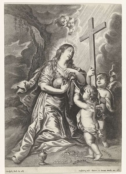 Editor: This print, "The Virgin seated with the infant Christ on her lap, the young Saint John the Baptist kneeling on Christ's cradle and kissing his foot, a lamb at right, after Reni" by Jean Boulanger, created sometime between 1645 and 1680, features Mary with the two children in a very intimate setting. The textures, from the curtain to the lamb's wool, seem incredibly detailed for an engraving. What can you tell me about the historical context of this piece? Curator: This print offers an intriguing lens through which to view the socio-political role of religious imagery in 17th-century Europe. Prints like these, often based on paintings by celebrated artists such as Guido Reni, facilitated the dissemination of religious ideals and Baroque aesthetics beyond the elite circles who could afford original artworks. The demand for these images speaks to the church’s efforts to engage with a broader audience, wouldn't you agree? Editor: I see what you mean. So, it's less about individual artistic expression and more about mass communication and the influence of the church. Curator: Exactly! Think of it as early modern propaganda, subtly reinforcing religious narratives and social hierarchies. Consider, too, where this would be displayed. Not in a museum, obviously, but likely in a private home, or perhaps a less affluent church. Its public function differs greatly from that of a monumental altarpiece. How might that change our understanding of its purpose? Editor: That's fascinating! I never considered how the artwork's *intended* audience could shape its meaning so much. It definitely adds another layer to appreciate. Thank you! Curator: And thank you. It's important to consider the artwork's journey from the artist's studio to its place in the world.