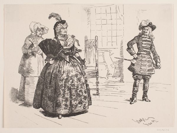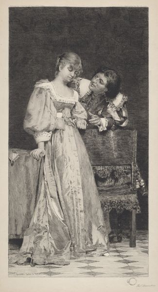Editor: Goya's "The Duchess of Alba and Her Duenna," painted in 1795 with oil paint, presents an interesting dynamic. The Duchess, shrouded in shadow, brandishes a switch almost menacingly at the older woman. What kind of power dynamic is at play here? Curator: The duenna, with her concerned expression, touches her throat. It's as if she’s trying to protect herself. Notice how the duenna is bathed in light, contrasting with the shadowy Duchess. Light and shadow often represent knowledge and ignorance, exposure and concealment. Editor: So, is Goya using this light and shadow to tell us something specific about their roles, and how society at the time may have perceived their roles? Curator: Perhaps. And look at what the Duchess holds. What is she pointing? It is not merely a switch, I believe, it is an instrument of control. Is she threatening to punish the duenna? Or is this symbolic, a comment on the social structure? The averted gaze makes me wonder...is she ashamed? Editor: That’s intriguing! I was focused on the power imbalance and possible malice, but now I see this also could suggest social anxieties of the time...the duchess, even in a position of power, also being constrained. Curator: Exactly! And the dark background obscures the surroundings. Perhaps, the figures are caught in a personal drama and a reflection on shifting social mores. Editor: It is definitely not as straightforward as I first assumed. The symbol of the switch could really be interpreted on different levels. Curator: Goya asks us to look beneath the surface, search the subtext, question assumed meanings and what this switch symbolizes in this theatre of the social hierarchy.