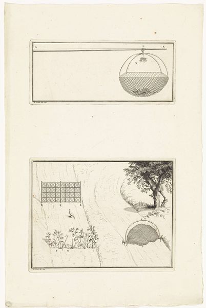 Curator: Let's take a closer look at this engraving by Bernard Picart, titled "Platte kooi en dierenvallen," created around 1730. Editor: It strikes me as incredibly diagrammatic. There's a starkness to the lines, an almost clinical quality to the way these animal traps are depicted. I feel a real detachment despite the subject matter. Curator: Indeed. Picart's rendering reveals a methodical approach, doesn't it? As a historian, what jumps out is how this reflects a changing attitude toward nature in the 18th century. A growing desire to understand and control the natural world through categorization and even exploitation. Editor: From a materialist point of view, I see the careful etching technique, each line painstakingly placed to illustrate the construction of these traps. It emphasizes human labor involved in fashioning these devices. Think of the material sourcing, the joinery involved. This isn't just art, it's a record of practical, applied knowledge. Curator: Precisely. The "Platte kooi en dierenvallen" reveals both artistic skill and a period preoccupation with human ingenuity triumphing over nature. The traps, depicted so cleanly, almost take on an abstract, aesthetic quality themselves, which kind of hides its violent function. Editor: I'd say Picart wants to emphasize those practical elements. He highlights the intersections, the supports, making them legible to someone attempting to build their own. The print becomes a functional object in itself, instructions almost. But who was meant to view or buy this artwork at the time? Were these techniques new and cutting edge? Curator: It circulated amongst the educated middle class who enjoyed seeing evidence of technological innovation as a source of enlightenment and societal progress. Consider this piece in light of contemporaneous discussions regarding economic and social mobility... these traps supported individuals and communities. Editor: Thanks to Picart's skilled lines, this work continues to intrigue and reveal itself, despite the many years since its creation. Curator: An excellent reminder to be grateful for artworks like this, allowing glimpses of past approaches to life and ecology!