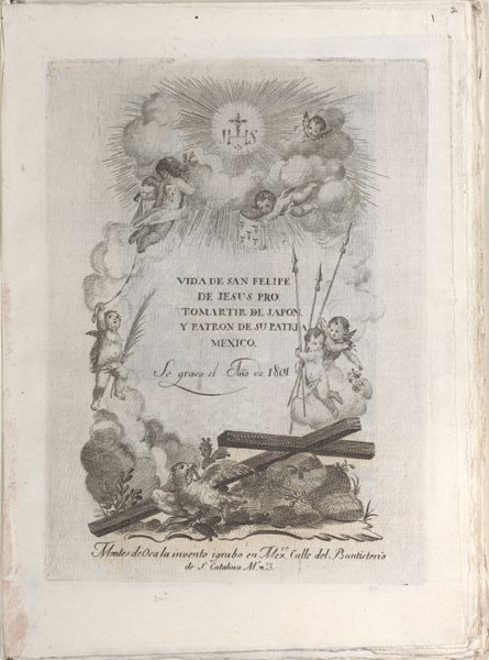 Curator: This is an engraving from 1822 titled "Maria en twee jongens bij een offerzuil," or "Maria and two boys at an offering pillar," created by Pieter Holmes. Editor: Right off the bat, it’s striking how serene yet didactic it feels. It has a delicate, almost ethereal quality but carries a strong sense of religious instruction. The paper seems so fragile; you can almost feel the history embedded in it. Curator: It's fascinating how Holmes uses a seemingly idyllic scene to convey religious doctrine. Consider the role of imagery in religious education at the time; engravings like this served to instill beliefs and values in the younger generation. It blends aesthetics with a didactic agenda. Editor: Precisely. And the boys—one presenting something, the other seemingly studying an illuminated manuscript, almost like a child-sized breviary, surrounded by artistic paraphernalia. The harp and palette seem like instruments for glorifying religion itself. There is this very subtle feeling that everything will be okay if they study these objects of faith. Curator: The presence of both boys highlights the intended audience of such imagery: the young faithful in need of instruction. The symbolic weight carried by Maria with the offering pillar, contrasts the future artistic achievements suggested in their books and instruments. The piece subtly directs their path towards religious artistic pursuit. Editor: Indeed, and what an intimate, concentrated tableau! The figures, arranged in the soft light. They appear so composed in contrast to the unknown world surrounding them. One has the impression that this work of art has a dual aim; it creates the peace while inspiring creation. Curator: It serves as a cultural artifact, encapsulating the period's attitudes toward faith, learning, and the role of visual representation in disseminating ideological beliefs. Editor: I will leave it thinking of all the different ways one can interpret these images from the past, each with its little revelations. Curator: Yes, it encourages contemplation, much like the quiet devotion it depicts.