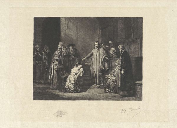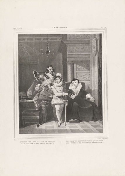 Editor: Here we have Johann Wilhelm Kaiser's engraving, "Bijeenkomst te Dendermonde met Willem van Oranje, 1566", dating from 1847-1849. It depicts a serious gathering of figures. I get the impression of hushed intensity, almost like a clandestine meeting frozen in time. What do you see in this piece, especially beyond just the historical context? Curator: Beyond the history, which vibrates subtly here, I feel the weight of unspoken intentions. Notice the interplay of light and shadow; Kaiser uses it to carve out distinct pockets of emotion within the scene. It's almost like we're peering into the minds of each participant, witnessing their internal dialogues play out on their faces. Have you ever felt caught in the midst of such silent, charged atmospheres? Editor: Absolutely. The lighting definitely adds a dramatic touch. What strikes me is how centered the composition is – with the focus on what I presume are the documents being discussed, like a gravitational pull on everyone's attention. Curator: Precisely! It's more than just documents; they become a mirror reflecting the aspirations, fears, and ambitions of those gathered. Look closely at how the lines of the engraving pull our gaze back to those papers – a clever trick, right? But let’s consider, isn't it interesting how Kaiser chose to render such a politically charged scene in such an…intimate, almost domestic setting? Editor: That's a great point; it creates this fascinating contrast between the gravity of the historical moment and the quiet, closed-door feel of the scene. I hadn’t quite picked up on that. Curator: Art, at its finest, offers endless reflective spaces. Editor: This really makes me rethink historical depictions, moving beyond mere representation into the realm of psychological insight. Thanks!