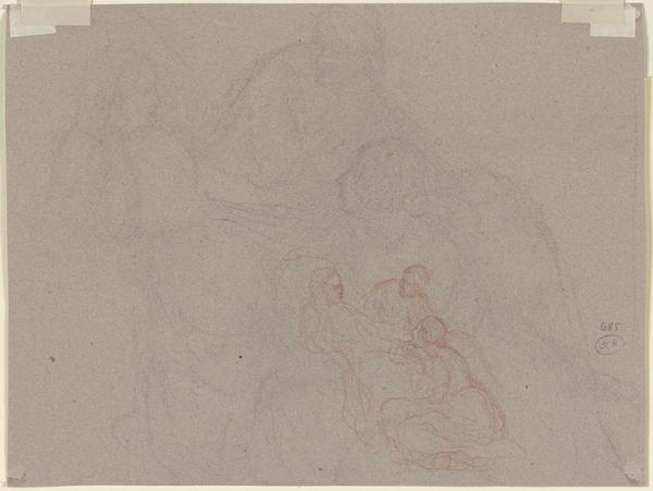 Curator: Right now, we're looking at "Tanzendes Paar, daruber schwebend ein Putto mit Musikinstrument," held here at the Städel Museum. It’s rendered with pencil and chalk on paper, attributed to Victor Müller. What leaps out at you? Editor: Ethereal is the first word that comes to mind. It’s a fleeting impression, like a dream half-remembered, or a wish about to be released into the world. It’s light on light, figures barely defined. Curator: Absolutely. You notice the lightness of the drawing itself – it seems so preliminary, more like a quick study. The image pulls us towards themes of aspiration, perhaps longing for grace. The dancing couple beneath this floating cherub suggests not just romance, but an elevated state. A union blessed, almost? Editor: Precisely! And that’s where the symbols begin to deepen. Dance, traditionally, is the ritualistic movement of bodies, sometimes into ecstatic trance or divine contact. The cherub, of course, brings the overtone of religious and emotional heightening, suggesting innocence or heavenly joy poured down upon the couple. I also notice how the couple isn’t defined by hard outlines; it creates an ambiguity. Are they emerging or dissolving? Are they becoming one or distinct entities within this dance? Curator: I love that interpretation, the ambiguity of becoming. It opens so many possibilities. Maybe that uncertainty mirrors the tender beginnings of a relationship – that blurred space before clarity solidifies. Or, on a less romantic, more human scale, it might reflect something ephemeral in every embrace and every connection? Editor: Beautifully put. The rough, unfinished character adds a poignant vulnerability, too. It suggests that this "blessed" moment might still be tentative, needing careful cherishing, as though an excess of energy could cause its evaporation. As always with symbols, light holds the capacity to turn harsh! Curator: True. It makes one appreciate how subtly potent such works can be – quiet whispers, more profound than grandiose statements. It’s a drawing that breathes and invites intimate, personal projection. It feels very human despite the supernatural. Editor: A tenderly rendered work that seems to celebrate, to invoke moments where love, hope, or dreams feel tangibly real. What a beautifully fragile, and human work to consider today.
