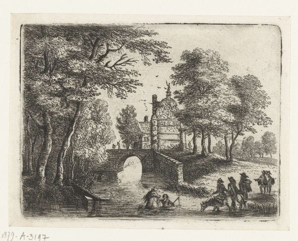 Editor: This etching, "Winter Landscape with a Stone Bridge" by Jan van de Cappelle, made sometime between 1640 and 1679, presents a frozen scene. The skaters on the ice and smoking chimneys suggest daily life continuing despite the winter, but there is also a certain isolation to the bare trees and stark landscape. What do you see in this piece? Curator: I see the piece as a study in material existence and the impact of production on daily life. Note the stark contrast between the labor evident in the construction of the stone bridge, the thatched roofs, and the leisure activities of skating. Each requires a different kind of exertion, impacting the very material of their lives, wouldn't you agree? Editor: That's an interesting point, I hadn't thought about leisure as labor’s counterpoint in a way. What about the choice of printmaking as a medium? Curator: The print medium is key. It allowed for the broader distribution of this scene, making images of everyday Dutch life accessible. This accessibility also democratizes art. Consider that etching itself involves a specific labor – the skilled hand of the etcher using acids on a metal plate to create the design and create art available to the people. Editor: So, the act of creating the print itself is relevant to understanding the social and cultural impact of the artwork? Curator: Precisely! We shouldn’t see it just as a quaint landscape. It's an artifact documenting social stratification, the role of labor, and the burgeoning accessibility of images in 17th-century Dutch society. These prints shaped material culture, defining ideas about domesticity, labor, and leisure for an expanding audience. Editor: That adds so many layers to how I initially perceived it. Thinking about the means of production provides a far richer interpretation. Curator: Absolutely, this piece reminds us that art is never created in a vacuum but through the interactions of materials, labor, and a constantly evolving society.