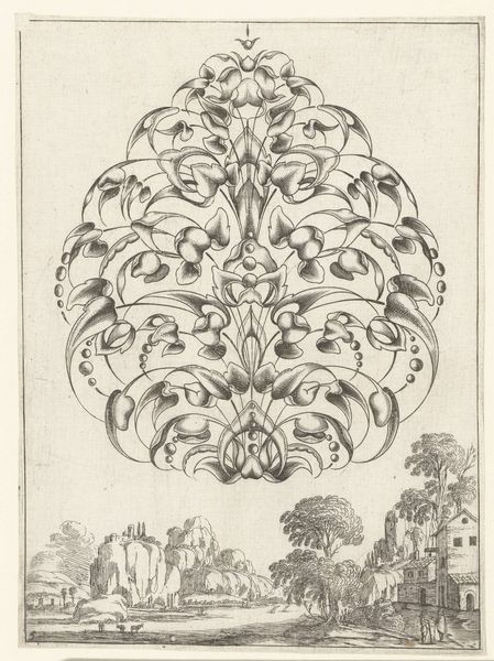 This print, "Le dragon qui se void dans le jardin de Ruel," was made by François Le Febvre in the 17th century, likely through etching or engraving. Here, it’s not so much the material, but the *idea* of materials that counts. Le Febvre has given us an image of bejeweled ornaments hanging over a formal garden. The arrangement is a celebration of luxury, even excess. The gemstones, rendered in painstaking detail, speak to the wealth and labor required to extract, cut, and set them. In the 1600s, the production of prints like this one was becoming increasingly standardized, a nascent form of industrialization. Consider the contrast: the artist's skilled hand, recording elite consumption. He has left us with a memento of a social world defined by both privilege, and, one might argue, the exploitation that makes it possible. Ultimately, this print reminds us that even seemingly straightforward images are embedded in complex social and economic realities.