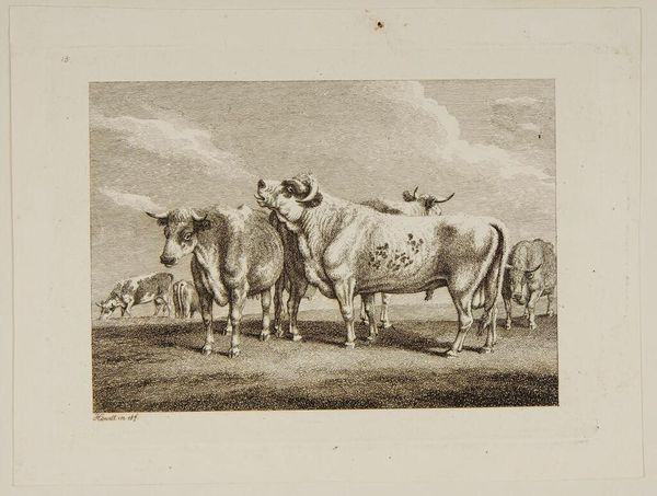 Wilhelm Heuer created this print, Three Cows, using engraving. The composition is dominated by the contrast between the cows in the foreground and the muted background. The artist's formal concerns are evident through the manipulation of light and shadow to create depth and volume, particularly in the rendering of the cows' bodies. Heuer explores the relationship between naturalism and idealization. The cows are depicted with meticulous attention to detail, yet they also embody a sense of pastoral tranquility, characteristic of classical landscape painting. This engraving engages with broader philosophical concerns about nature, representation, and the role of the artist in interpreting the world. The formal structure encourages us to see the cows not just as animals, but as symbols of a harmonious relationship between humanity and the natural world. The texture and the tonal gradations create a complex interplay of light and shadow, thereby inviting us to question the boundaries between reality and representation.