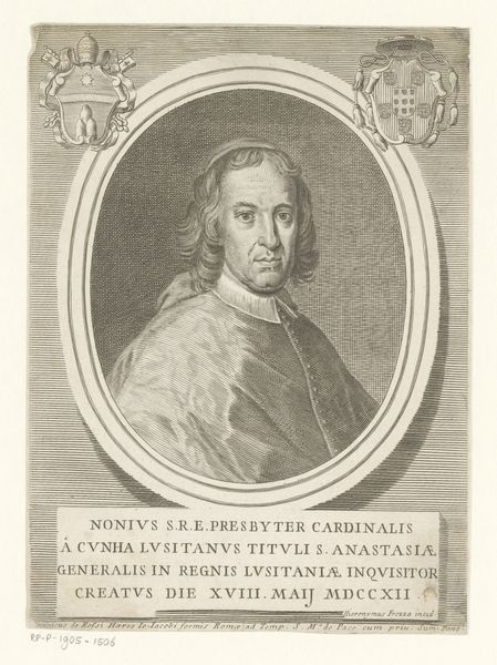 Curator: This image is a portrait of Cesare Rasponi, a cardinal during the time of Pope Alessandro VII. The engraving is believed to have been made between 1660 and 1685 by Johann Martin Lerch and currently resides in the Rijksmuseum. Editor: He certainly projects a certain kind of stern authority. But seeing this in monochrome makes me wonder: what ink, paper, tools gave Lerch the greatest tonal control? Was this designed for widespread consumption, influencing opinions of Rasponi, or a more limited audience? Curator: An interesting question, and one which reflects on artistic production as shaped by socio-political forces. Lerch’s access to tools, the patronage system of the era, these undoubtedly informed the availability of the engraving and ultimately influenced the perception of Cesare Rasponi within those who could access printed imagery. Editor: Engraving inherently becomes a dialogue with replication and distribution. Each strike of the tool against the metal plate is part of this process of image-making, from inception to audience impact. The texture here comes less from surface materiality, instead it derives from the mechanical and social reproduction capabilities inherent to engraving as a printmaking medium. Curator: Exactly! Consider the role of printmaking in disseminating imagery and solidifying reputations, particularly for figures of power within the Catholic Church. Prints such as this were not mere representations, but potent tools in shaping public opinion and bolstering authority, or the inverse. How does the mass availability of prints shift understandings of individuality and worth? Editor: Well, this specific artwork really makes one ponder the artist's intent to circulate certain ideologies within the Church during the period when printed material was increasingly widespread. We cannot really divorce the material choices from those of influence and meaning. Curator: Indeed, it all goes into making a complete historical picture, revealing the complicated and nuanced interaction between material culture and historical narrative. Editor: Thinking about this engraving, its availability, gives a fuller sense of artistic agency beyond simply technical skill or expression.