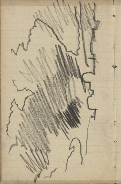 Curator: Here at the Rijksmuseum, we’re looking at George Hendrik Breitner’s “Landschap,” a landscape rendered in pencil between 1887 and 1891. Editor: Immediately striking is its raw energy. It’s just a flurry of lines, a gestural sketch, isn't it? So much implied, so little definitively stated. Curator: Indeed. It's almost a transcription of a fleeting impression, evocative of memory more than explicit representation. The quickness speaks to Impressionism. Look at the ambiguous marks-- are they trees? Buildings? Breitner captures atmosphere through suggestion. Editor: I’m drawn to the upper right. Those three almost parallel lines leaning in on each other—there’s a graphic quality there. They carve into the page and divide it so actively—a stark simplicity against the more frenetic sketching to its left. Curator: One could even read into that a suggestion of the sublime, of nature as overwhelming, pressing in on human habitation, as represented by the possible building to the left. Even without firm details, a certain weight or impending pressure is there. Editor: Perhaps it also functions as an arrow or marker, our perspective pointing down, down to the bottom corner. I find this almost monochromatic composition really brings attention to its textural character. You lose so much of that with color. Curator: The sketch possesses an unfinished quality that I believe speaks volumes to its power as a symbol, an ode to life's continuous, ephemeral transitions. As much is not told to us than we know, but even more that can never be transcribed accurately to represent experience. Editor: Seeing this type of landscape distilled to its purest structural elements really clarifies how a mere handful of compositional relationships can communicate something powerful. This is such an efficient visual statement! Curator: Indeed, I find the drawing remarkably poignant in its starkness. It brings into focus how the sparsest of strokes can evoke our shared understanding of the natural world. Editor: Well, for me it highlights that visual energy trumps detail; that incompleteness itself invites more immersive contemplation of a landscape.