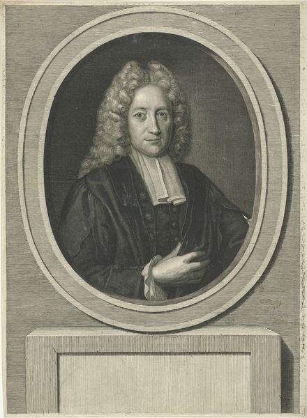 This is a portrait of Christoph Sonntag, made by Georg Daniel Heumann, using engraving techniques. The meticulous lines and shading create a compelling visual experience, dominated by the oval frame within which the subject sits. The portrait's composition is rigidly symmetrical. Sonntag is centered, his gaze direct, confronting the viewer. His voluminous wig, meticulously rendered, draws attention not just to the detail, but also to how such adornment signifies social status. The inscription below the portrait does more than identify Sonntag; it constructs a system of signs, underscoring his theological and academic credentials. The image therefore functions as a statement of identity, power, and social positioning within a hierarchical society. Note the sharp, precise lines and the contrasting textures of the wig, the robes, and the smooth skin. The interplay between these textures emphasizes the artifice inherent in portraiture. The engraver has skillfully translated the textures of fabric and hair into a complex language of lines and dots. This emphasizes that representation is always a constructed reality, a play of surfaces and signs.