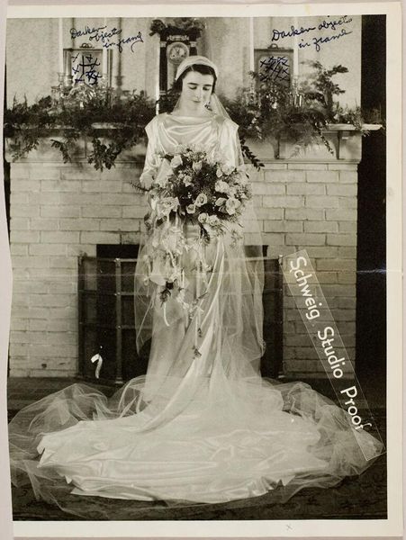 Editor: Here we have an untitled photograph by Martin Schweig, showing a bride and her bridesmaids. It's a black and white image, giving it a classic feel. What compositional elements stand out to you? Curator: The arrangement of the figures creates a strong central focus on the bride, flanked symmetrically by the bridesmaids. The use of light and shadow across the fabric of their gowns is quite effective in defining form and texture. Note also the verticality established by the candles and the figures themselves; this is cleverly contrasted with the curvilinear forms of the floral arrangements. Editor: That's fascinating, I hadn't considered the contrast between vertical and curvilinear forms. Thanks for pointing that out! Curator: Indeed. A close consideration of the formal elements reveals a sophisticated understanding of visual language.