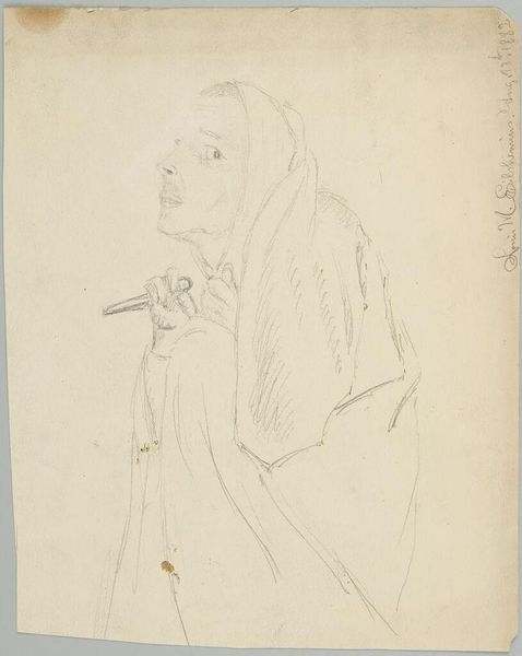 Curator: Santiago Rusiñol's pencil drawing, "Seated Girl," created around 1883, is the artwork we're looking at today. What jumps out at you? Editor: The gaze is so direct, isn’t it? Yet also strangely distant. Like she's looking right *through* you, to something else entirely. And the looseness of the lines, the way the form just barely emerges...it feels fragile, almost ephemeral. Curator: Rusiñol was part of the Catalan modernista movement. He was deeply interested in capturing fleeting moments, genuine emotion, which might explain the sense of immediacy we get here. The scarf framing her face evokes religious iconography, but then again, it could simply be a practical head covering for the time. Editor: Right, a practical choice that, by accident or design, echoes centuries of veiled women. Scarves and veils have always carried such weight in art, signifiers of everything from modesty and piety to mystery and even mourning. You could lose yourself just untangling that symbolism alone. Her scarf appears to serve as a cocoon almost. Curator: There's also the tension between the finished details – look at the attention to her face, compared to the almost gestural rendering of her body. Did he lose interest, perhaps? Or was it a conscious decision, to draw us towards her expression, towards that unknowable inner life you mentioned? Editor: Possibly! The sketch invites you to bring it into life. But I love how unfinished art can be a sort of collaboration with the viewer. You fill in the blanks, add your own interpretation to what Rusiñol started. Curator: I agree. Rusiñol provides an essence, but the emotion it brings out lives in the spectator. Editor: Ultimately, that girl’s silent intensity gives you far more than just a sketch. Curator: A ghost to contemplate...