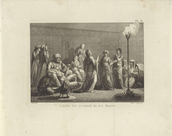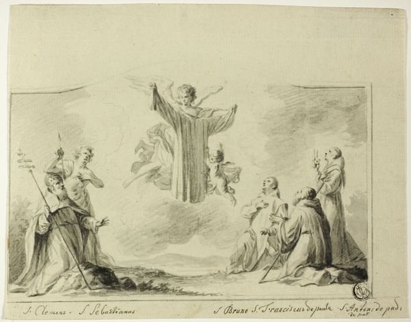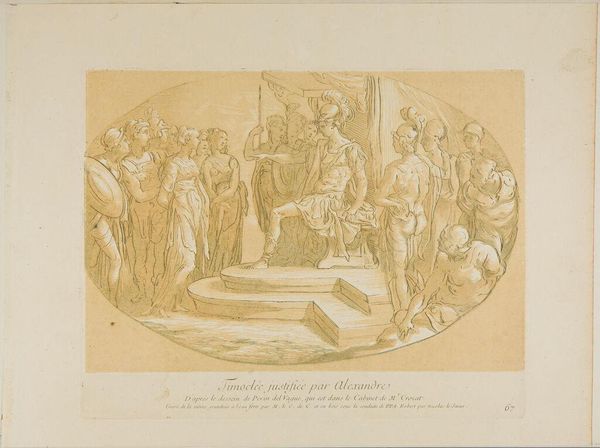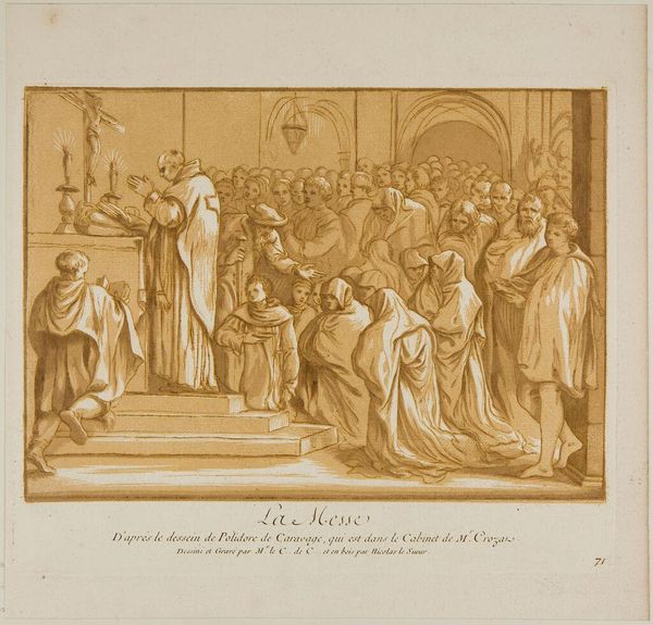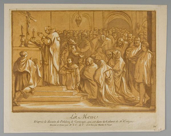 Curator: This is Paul-Ponce-Antoine Robert's "Christ Giving the Keys to Saint Peter," currently residing at the Harvard Art Museums. The print presents a pivotal scene. Editor: The keys feel quite significant; their symbolism is deeply rooted in the history of the Church, representing authority and the power to bind and loose. Curator: The brown ink—sepia—enhances the texture of the figures' garments, creating a tangible quality. The choice of material and the etching process draw our attention to how religious narratives were disseminated and consumed as commodities. Editor: Absolutely, the keys aren’t just metal objects; they are potent symbols of institutional power and spiritual inheritance passed down through generations. The gesture of handing them over is charged. Curator: It's fascinating to consider how Robert’s print functions within a larger economy of images and devotional objects circulating at the time. Editor: Precisely, viewing the artwork through both symbolic and material lenses offers a richer, layered understanding of its original context.