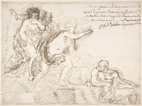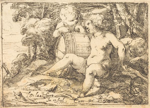 Curator: David Kindt’s "Bathing Woman by a River," created around 1612, presents a compelling study in Mannerist figuration. Editor: My initial reaction is to the drawing's light airiness, which, despite its subdued color, emanates a vibrant sense of freedom and light. Curator: The nude figure, likely referencing mythological subjects, occupies a space that seems both natural and imagined. In Kindt's era, such depictions weren't merely aesthetic; they engaged with discourses of beauty, morality, and the power dynamics inherent in representing the female form. Editor: Agreed, but looking more closely at the linearity and its sinuous character— the body, the landscape, all rendered with elegant lines and refined strokes—I think what is more successful is how these elements create an overall impression of refined beauty that supersedes meaning. The balance created here between volume and surface, to my eye, establishes something greater. Curator: Interesting observation. Viewing through the lens of contemporary theory allows me to view it not just as a representation of classical themes but as an engagement with the era's views on gender roles. The positioning of the woman, her apparent submissiveness, invites conversation on societal expectations of female behavior. Editor: Certainly the historical context provides a basis, but I see this more as an interpretation of form and light. The emphasis, from my perspective, falls squarely on this very elegant manipulation of lines. Look at the trees, look at the clouds, everything serves the fundamental formal properties. Curator: Perhaps this interplay underscores how art history intertwines with contemporary relevance—allowing us to see both the enduring power of aesthetic principles and their impact on historical frameworks. Editor: Precisely, art possesses this wonderful capacity to be viewed from varying perspectives; it serves as both historical record and demonstration of eternal truths in art, like line and form.