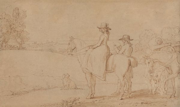 Curator: We're now observing "Ruiter met hond op een landweg," which translates to "Rider with dog on a country road." Johannes Tavenraat created this pencil sketch sometime between 1843 and 1844, and it currently resides in the Rijksmuseum. Editor: The dynamism in this sketch really jumps out. The immediacy and lightness of touch feel very modern to me; you get a strong sense of movement, even in a static image. Curator: Indeed. Observe the textural variation achieved solely through pencil. See how the artist utilizes hatching and cross-hatching to delineate form and shadow, especially notable in the rendering of the horse's musculature. This precise technique enhances the composition's visual weight and balances the lightness in other parts. Editor: The labor involved, though, it's evident. You can almost feel Tavenraat's hand moving across the paper, adjusting the pressure, shifting the angle to build up these forms from a series of marks. And that choice of pencil, such a humble, readily available tool... it speaks to accessibility in art-making. Curator: Your perspective on materiality provides a different reading, but I interpret Tavenraat's choice through formal constraints, offering precision to create light and form with subtle tonal graduation. Note also the deliberate spatial arrangement. Editor: Precisely! He isn't interested only in depicting the elite class, but uses accessible materials showing all the effort required to even reproduce the landscape. Curator: Well, whether one interprets it as intentional, or merely a necessity of artistic practice at the time, it contributes undeniably to the sketch's impact. It's compelling how different methodologies of viewing—yours attuned to materiality and mine to the structure—converge to offer deeper insight. Editor: Exactly. Understanding that art is made of effort, materials and skill allows to fully explore the range of possibilities artists experimented with. Curator: Such insight! Thank you for sharing your point of view with me. Editor: Likewise! A fascinating example of the productive dialogue between approaches to viewing.