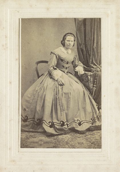 Curator: This dignified "Portret van een staande vrouw," captured between 1860 and 1870, is a gelatin-silver print attributed to the studio of Baldi & Würthle. What’s your first impression? Editor: Oh, she exudes such restrained power, doesn't she? The severe pose, that huge dress... almost a fortress. I immediately want to know her story. Curator: Exactly! Those early photographs feel like little time capsules. The very act of posing probably felt so deliberate then. You can see how she uses the garment like a social armour, maybe trying to look older or richer than she actually was. What are the semiotic signals that reveal the nature of who this lady wanted to appear to the World? Editor: Those sleeves are something, aren't they? Puffed almost to the point of cartoonishness. They scream Victorian ideal, amplified and somewhat absurd. And the carpet is a signifier of something also, but I am unsure. Something to do with the house pride and cleanliness of her? A well ordered and kept house for a lady to preside? Curator: I agree, although a bit melancholic, like the faded colours represent the passage of time, and she stands still waiting for history to unfold... Editor: That somber mood really clings to it, doesn't it? I do wonder if it also signals a hidden defiance; there's something almost rebellious in the starkness of the portrait against the flowery expectations of that era. It would have taken such work to keep still for that length of time, a conscious and sustained dedication. Curator: A powerful snapshot from a time when self-expression was still so carefully mediated. Let´s just appreciate the magic of seeing into her World, so long ago. Editor: Absolutely. A portal into her carefully crafted reality.