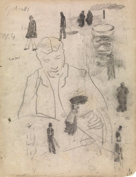 Editor: This is "Two Studies of a Seated Woman with a Hat" by George Hendrik Breitner, from 1895, done in pencil. It's currently at the Rijksmuseum. I'm struck by how informal and immediate it feels, almost like a glimpse into the artist's sketchbook. The lines are so free. What catches your eye when you look at it? Curator: It is interesting how you focus on the ‘sketchbook’ quality; I would say the lack of sharp contour allows for an almost painterly distribution of values across the composition. See how the hat in the foreground is established not only by line, but also by value–the mass of graphite on the turned-down brim, balanced against the bare paper within. Editor: I see what you mean about the interplay between the lines and the shaded areas that bring that forward figure to life. So, rather than focusing solely on the sketched form, Breitner almost sculpts the figure with light and shadow using just the pencil. Curator: Precisely. And consider how Breitner utilizes repetition—the dual depiction of the woman—not to merely replicate, but to explore varied orientations, planes and tonalities, contributing to a unified, though multifaceted, visual experience. Each view informs and enriches our comprehension of the subject. What do you make of the starkly visible lines that structure the overall image? Editor: They add a dynamic, unresolved feeling. It isn't polished and complete, but still offers us a window into Breitner's process. Thinking about your point on tonality and mine about process – seeing this made me think more deeply about the value of unfinished works in revealing an artist's exploration of form. Curator: Indeed, your emphasis on process sheds light on the structural integrity of this piece. I concede that it invites reflection on the provisional status of drawing as an art form in its own right.