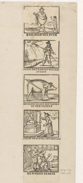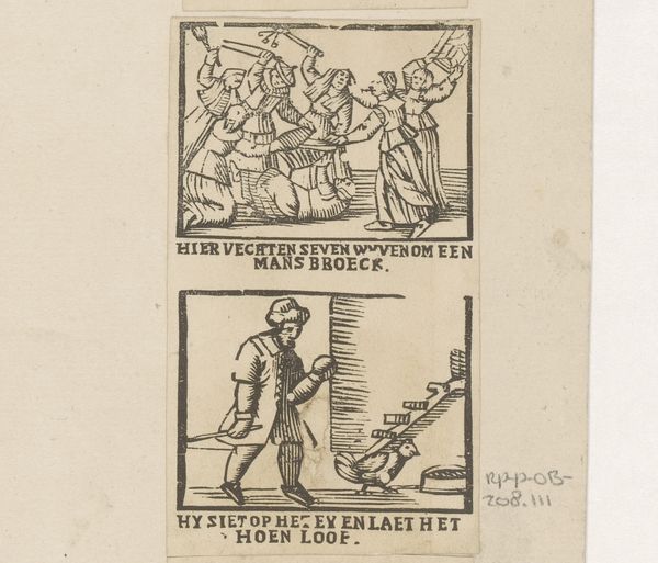 This anonymous print, "Afbeeldingh hoe seven wyven vechten om een mans broeck ende de vrou de broeck aentrecht," presents a series of visual proverbs, each laden with symbolic weight. Consider the figure adorned with windmills, who embodies the proverb, “this one waits with all winds.” The windmill— a symbol of adaptability. We see echoes of this figure in earlier depictions of Fortuna, the Roman goddess of fortune, often shown with a wheel or rudder, steering through the winds of fate. The presence of the windmill evokes not just an individual adapting to circumstances, but a deeper anxiety about control and direction in a world driven by capricious forces. This resonates with our own subconscious, where the fear of the unknown meets the human drive to navigate life’s unpredictable currents. The non-linear path of this symbol— from ancient goddess to Dutch proverb, mirrors the cyclical nature of human experience, always resurfacing, evolving, and finding new forms.