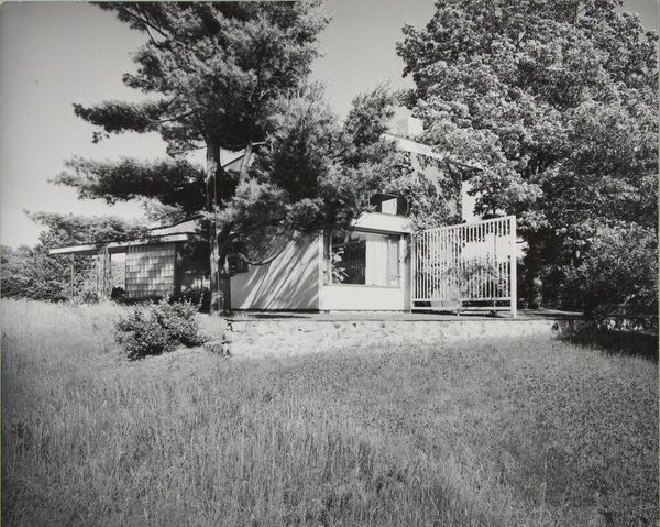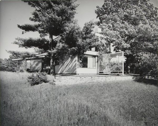Curator: Here we have Paul Davis' photograph of the Gropius Residence in Lincoln, Massachusetts, circa 1938. Editor: It's striking how modern it feels, even now, a clean geometry nestled in the green landscape. Peaceful, almost contemplative. Curator: Absolutely. Davis captured the essence of Gropius' Bauhaus ideals transferred to the American context. Note the interplay of glass, concrete, and wood—industrial materials juxtaposed with the natural surroundings. Editor: It feels like a promise, doesn't it? That architecture could truly reshape our lives, blend seamlessly with nature… though I wonder about the actual lived experience within those walls. Curator: Precisely. The photograph frames the residence as both a social experiment and a carefully crafted aesthetic object, revealing the aspirations and potential contradictions of modernist design. Editor: A fascinating dance between utopia and reality, then. It's thought-provoking. Curator: Indeed, a study in material, method, and the dreams they construct.
