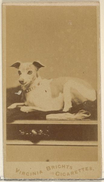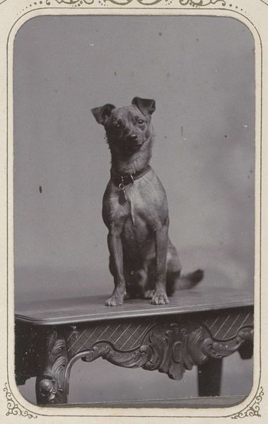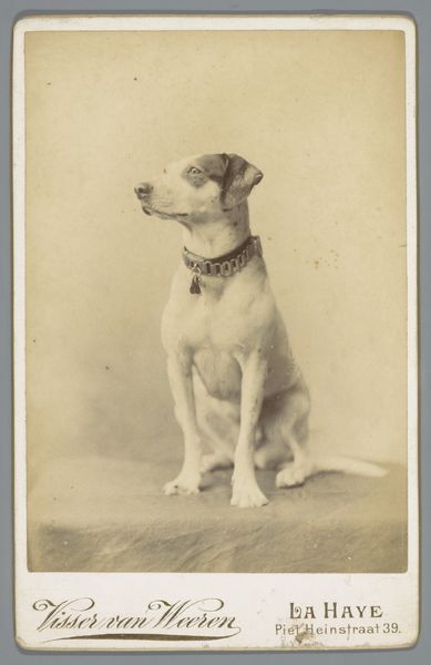 Curator: Here we have an intriguing photograph titled "Hond, zittend op een stoel," which translates to "Dog, Sitting on a Chair." Attributed to Jan George Mulder, it likely dates from between 1865 and 1887. Editor: Well, my first impression is that it is rather touching and quite humorous. The formality, that solemn pose… it’s almost human. Curator: Precisely. I find the composition rather compelling. Note the tonal range, a soft sepia that evokes a specific era, with subtle gradations that suggest a diffused light source. The contrast, however, is most evocative. Editor: It definitely makes one ponder the social implications of photographing pets in the late 19th century. What does it say about bourgeois society at that time, this desire to memorialize domestic animals in such a stately manner? The anthropomorphism is striking; the dog almost seems aware of its portrait being taken. Curator: A pertinent point. Look closer at the backdrop: minimalist, almost non-existent, drawing the eye immediately to the subject. Also, notice the dog's collar, a decorative touch, implying status and belonging. The dog has a defined identity within its social sphere. Editor: And that carefully constructed environment is integral. The portrait studio was as much a stage as a place of record. The deliberate placement of the dog, the gentle lighting, the formality—all point to photography solidifying its role in shaping how we perceive the world around us and our relationship with animals. Curator: Indeed. It provides a small window into the evolving conventions around animal representation, in this era the photographic image becomes intertwined with human emotions. Editor: Well, I leave this brief encounter feeling as though the Victorians managed to immortalize not only their pets but also their complex relationship with the natural world and rapidly changing social conventions. Curator: I agree. The restrained artistry on display compels one to admire how lines, forms, and light could construct much meaning and evoke rich stories in this historical capture.