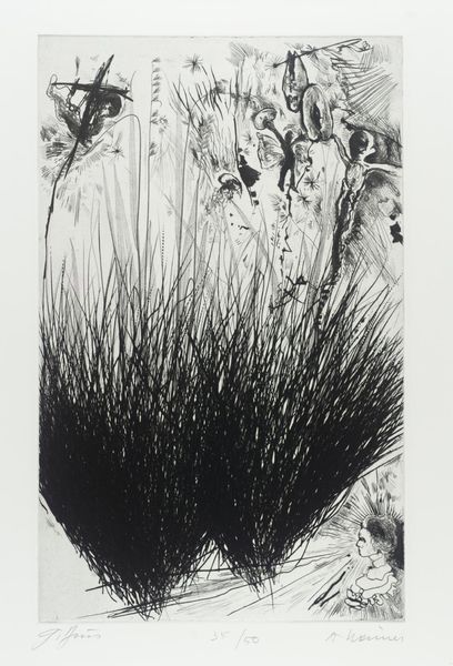 Editor: We’re looking at Cecil Collins’ “Angel of the Stars,” held at the Tate. It appears to be a print. The stark contrast and rough texture give it a somewhat ethereal, unsettling quality. What can you tell me about how it was made? Curator: Considering the process, the medium itself–likely a woodcut or linocut–dictates the bold contrasts. We see the artist’s hand laboring, cutting away material to reveal the image. Think of the social context: was this artwork intended for mass production, to democratize access to spiritual imagery, or was it a more personal endeavor? Editor: That's fascinating! It makes you think about who would have seen this and how they would have interacted with it. Curator: Exactly! The materials and methods of production connect the artist to a wider network of labor and consumption. What do you make of that? Editor: Thinking about the printmaking process certainly shifts my perspective on the image and its potential audience.