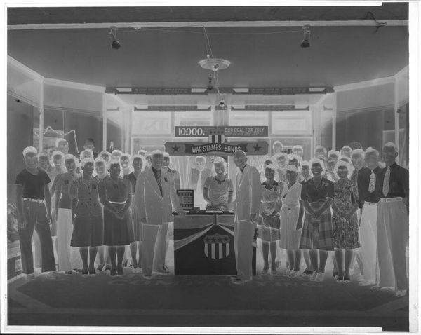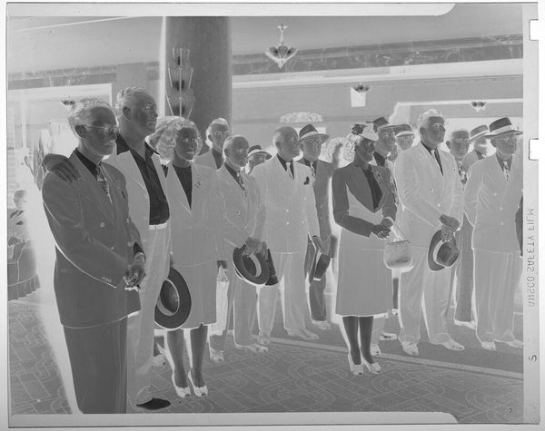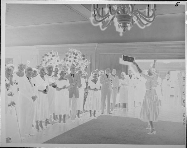 Editor: This is an untitled photograph by Martin Schweig, depicting a wedding receiving line. The inverted tones give it an eerie, dreamlike quality. What does this image say about the social rituals of marriage in its time? Curator: The photograph captures a specific social performance. The receiving line emphasizes the public aspect of marriage, marking a transition in social status. The women, likely bridesmaids, stand rigidly, almost like a chorus. Consider how the photographer frames them against the backdrop, subtly highlighting the constructed nature of the event. Editor: So, you're saying it's less about the individuals and more about the societal expectations? Curator: Precisely. The photograph seems to critique the prescribed roles within this ritual, perhaps hinting at the constraints placed upon women in particular. Editor: That's a perspective I hadn't considered; it's fascinating how a wedding photo can reveal so much more than just happiness. Curator: Indeed, and it reminds us that art often reflects and questions the social norms of its time.