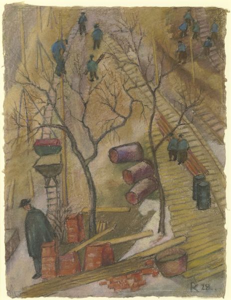 Curator: Looking at this piece, titled "Building site of I. G. Farben," created circa 1928-1930 and currently residing here at the Städel Museum, I'm immediately struck by the muted color palette and the unsettling sense of perspective. Editor: There's a feeling of oppression and impending doom, even without knowing the historical context. The colored pencils, chalk and pastel mediums used on paper seem to soften the scene, yet fail to disguise the harsh industrial elements. It definitely speaks to the alienating experience of industrialisation and forced labor. Curator: Exactly. I think it's vital to unpack the significance of the I.G. Farben building project. This was, of course, the future headquarters of a massive chemical conglomerate deeply implicated in the Holocaust during World War II. This drawing can be considered in light of complicity and corporate power. Editor: So, even though the drawing doesn’t directly depict the atrocities, its power resides in this looming premonition? This scene of frenetic activity, seemingly disconnected workers and haphazard tracks... What's being built isn’t progress or civilisation, but infrastructure for oppression. The workers here appear dehumanized, almost faceless, lost amidst this chaotic construction site. Are they representative of the marginalized laborers used to build the future? Curator: Absolutely. We must acknowledge how architectural spaces and landscapes are deeply connected to the exertion of social, economic, and political power. This drawing encapsulates a moment in time pregnant with historical weight. Editor: I hadn't thought about that. It is a powerful image because it captures the underlying ideologies of the I.G. Farben project. Thank you for shedding light on this dark side of progress, highlighting a crucial piece of history and power.