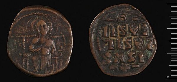 Curator: This is an Anonymous Follis, an intriguing artifact currently housed at the Harvard Art Museums. Editor: The first thing that strikes me is its weathered texture—it speaks of countless transactions, of journeys through time and trade. Curator: Exactly, and the imagery is key. The obverse depicts Christ, and the reverse features a Greek inscription, revealing Byzantine influences. Editor: The halo around Christ... it's not merely religious; it's a symbol of power, of imperial legitimacy inextricably linked to divine right. How did this iconography impact the coin's value? Curator: It's a constant negotiation. The coin represents both worldly authority and spiritual endorsement. This raises complex questions about how societies negotiate power. Editor: It definitely makes you consider the power dynamics embedded even in something as small as a coin. Curator: Absolutely, and exploring these layers helps us understand the coin's place within historical and cultural narratives.